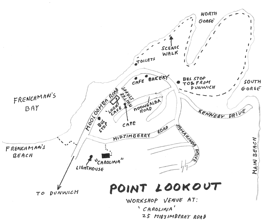 Location of bus stops and workshop venue. You can try asking the bus driver to let you off near Midjimberry road or the 'Look" cafe. Otherwise go to the final stop near Moongalba Road and walk back along Mooloomba Road (sea on your right) to Midjimberry Road. Turn left into Midjimberry Road a. A few yards down the road on your right look for a blue and white sign hanging from a tree saying 'Carolina'. Go up the stone path and bear left at the fork in the path. Welcome! |